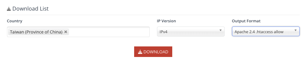 • 在Download List 輸入Taiwan(如果需要給更多地區進行POST動作,可以多加幾個,但限制的意義就會減少),Output Format選"Apache 2.4 .htaccess allow"