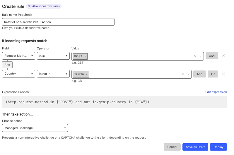 Cloudflare的話非常簡單,在Security > WAF內,直接加入"不在台灣"的POST動作就可以了。(Action 選"Managed Challenge"或者"Block"都可以)