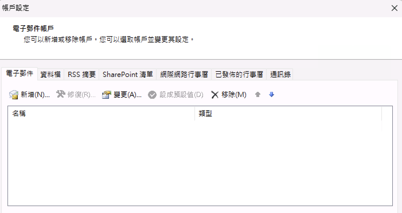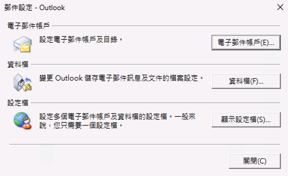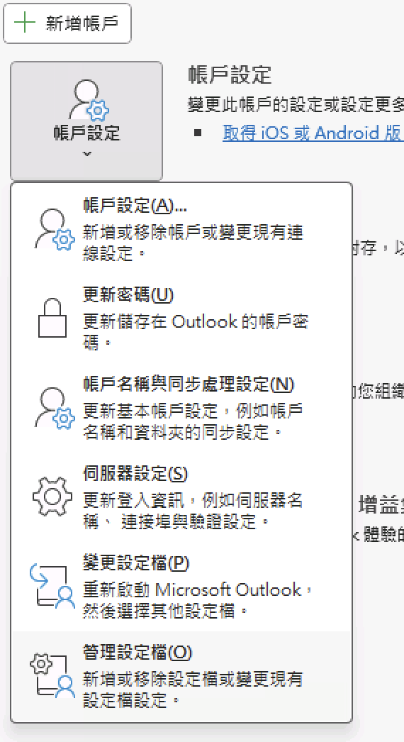 1) 在Outlook上方選「檔案」,按「帳戶設定」 > 「管理設定檔」 (按「新增帳戶」也可以,但有問題的時候沒有詳細錯誤訊息顯示)