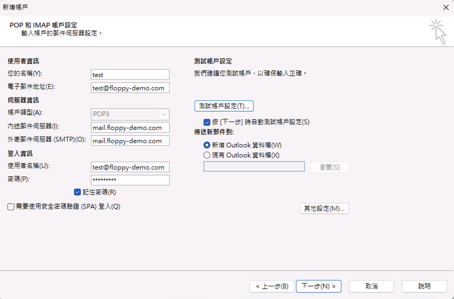 6) 按需求選擇「帳戶類型」是POP3還是IMAP,「內送郵件伺服器」和「外寄郵件伺服器」都是 「mail.網域名稱」 (如 mail.floppy-demo.com),然後按「其它設定」。