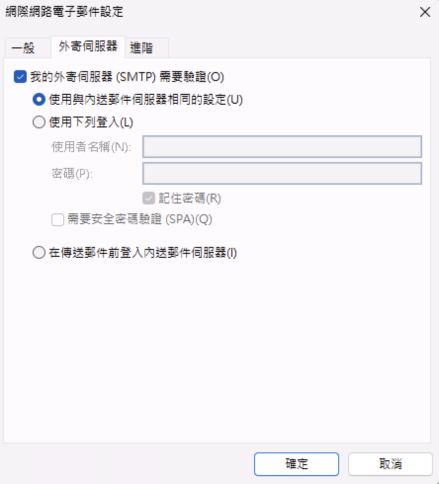 7)「其它設定」有兩個分頁需要設定,第一個是「外寄伺服器」,請勾選「我的外寄伺服器(SMTP)需要驗證」。