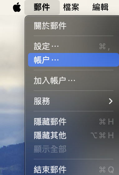 1) 在Mail App上方按「郵件」> 「帳戶」