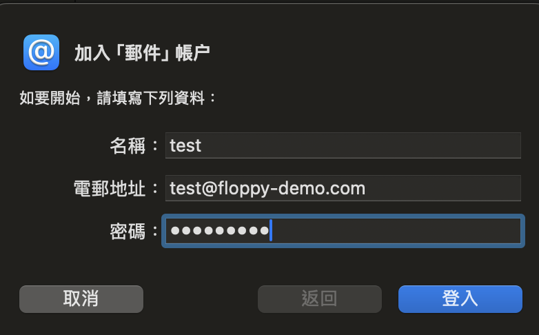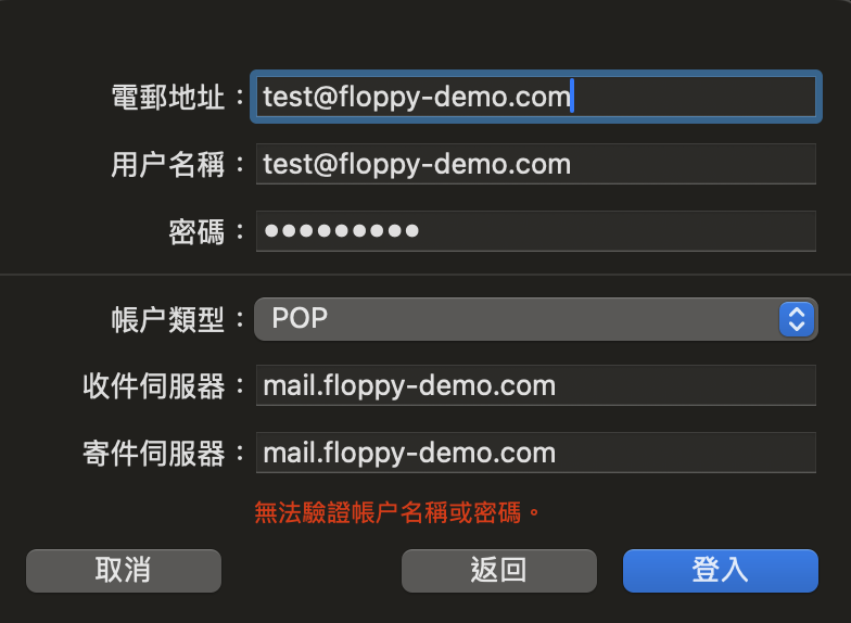5) 按需求選擇「帳戶類型」是POP3還是IMAP,「收件伺服器」和「寄件伺服器」都是 「mail.網域名稱」 (如 mail.floppy-demo.com),任何「自動」或「可留空」欄位都必須輸入正確資料,不能留空。