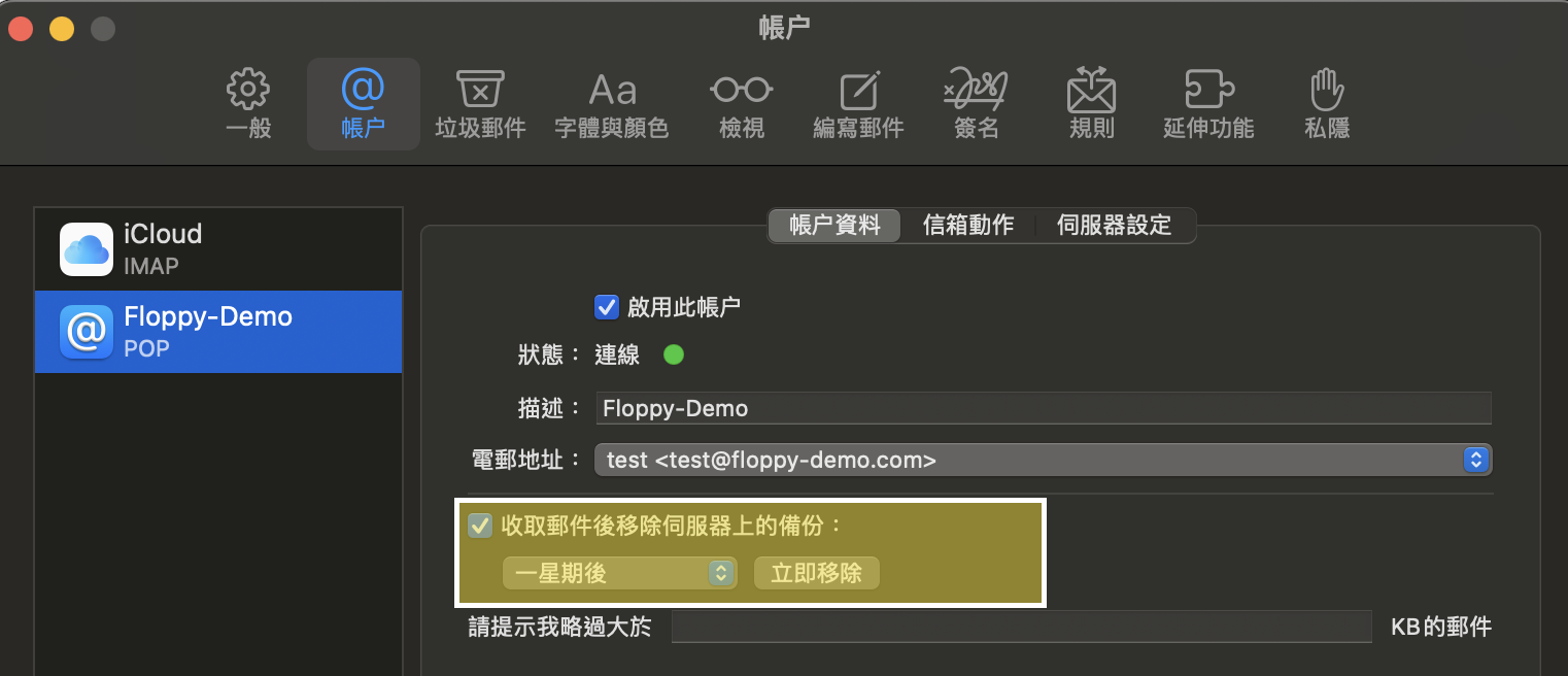 6) 下圖範例是POP3的設定,如果勾選「收取郵件後移除伺服器上的備份」,可以選擇保留最近特定天數的電郵資料在伺服器(完全不保留也可),相反不勾選的話,所有郵件都會累積在伺服器。