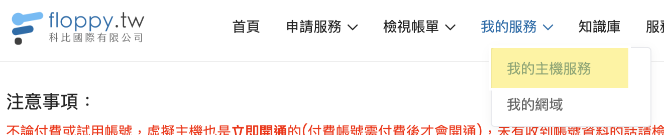 1) 登入 https://portal.floppy.tw 後,按「我的服務」>「我的主機服務」
